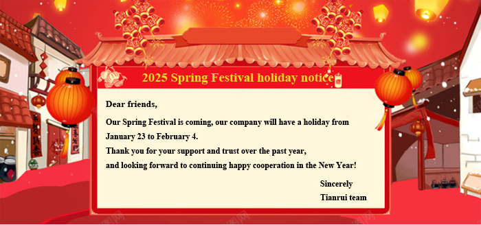 As we enter this new year, we look forward to continuing our partnership and providing you with the best products and services in the industry. Thank you for choosing XINXIANG TIANRUI HYDRAULIC EQUIPMENT CO.,LTD as your trusted supplier. We wish you a prosperous and joyful Spring Festival filled with happiness and success.